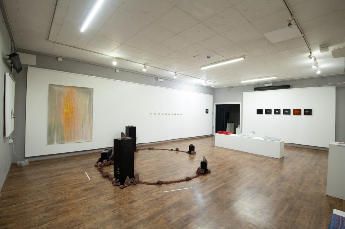 A few images of the exhibition in place at Florence Arts Centre: Half Lives / Gathering / The Flow, with artwork from Alistair Debling, Jamie Jenkinson and Cristina Picchi. Despite undertaking very different residency journeys, there’s a cohesion in their work – considering time, relationships to place, what’s seen and unseen. For more on their approaches, there’s background in our previous post here.
