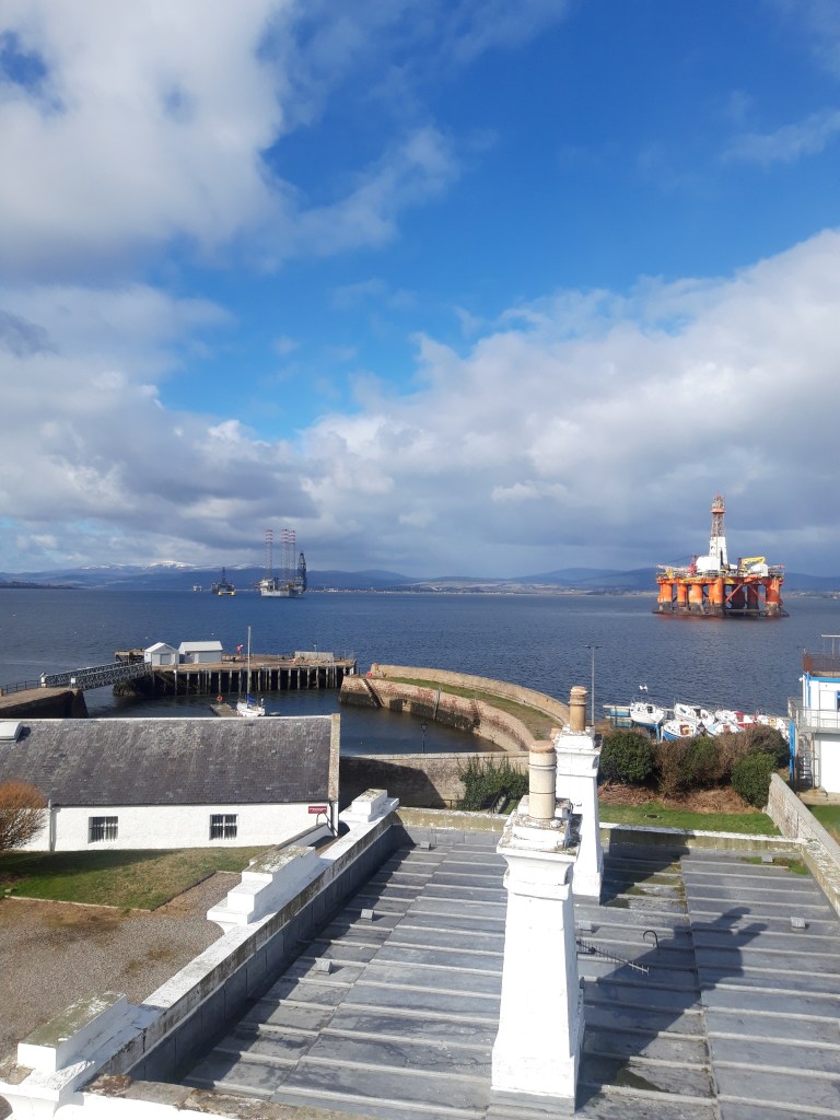 Earth gathered with care from Cornish mining run-off is ground into paint to form the image of a decommissioned oil rig on the Black Isle, where the Cromarty Firth has become a kind of graveyard for decommissioned structures.