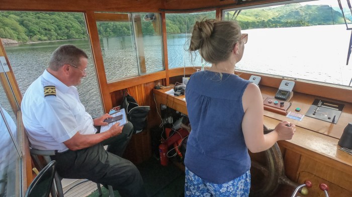 It’s not every day you get to drive a boat across the lake … Sarah with skipper Christian Grammar, who has been working on the boats for decades