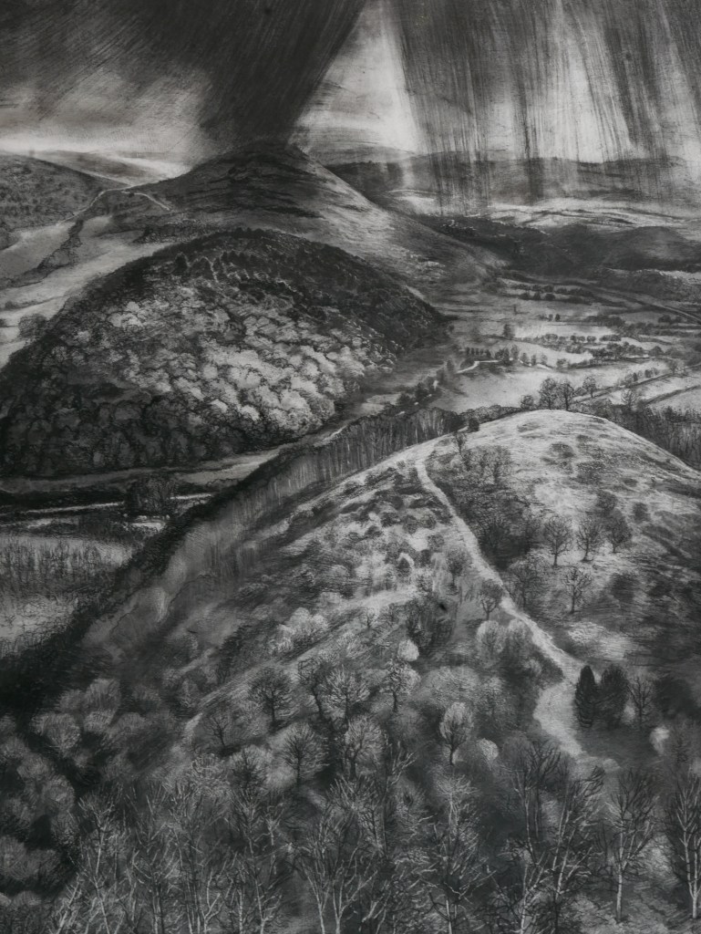 To experience landscape you have to walk it, to pace it out and get a grip the suface through the networks of paths, hedgerows, rippling contours – all the lines that establish and create rhythms. I am not a plein air painter. I work in the aftermath of expereincing landscape, looking backwards and recollecting it to forge an image attempting to capture the rhythms and converting that energy into pictorial space. The picture space might even hopefully suggest what one cannot see, perhaps a subterranean underworld. Making drawings and paintings involves process that can be like some geological processes – deposition, layering, stratification, erosion, faulting and folding of ideas into making an image. The process of drawing attempts to bring thoughts to light and bring drama to the surface. Hopefully the outcome is about remembering the light and thinking about whats left behind.